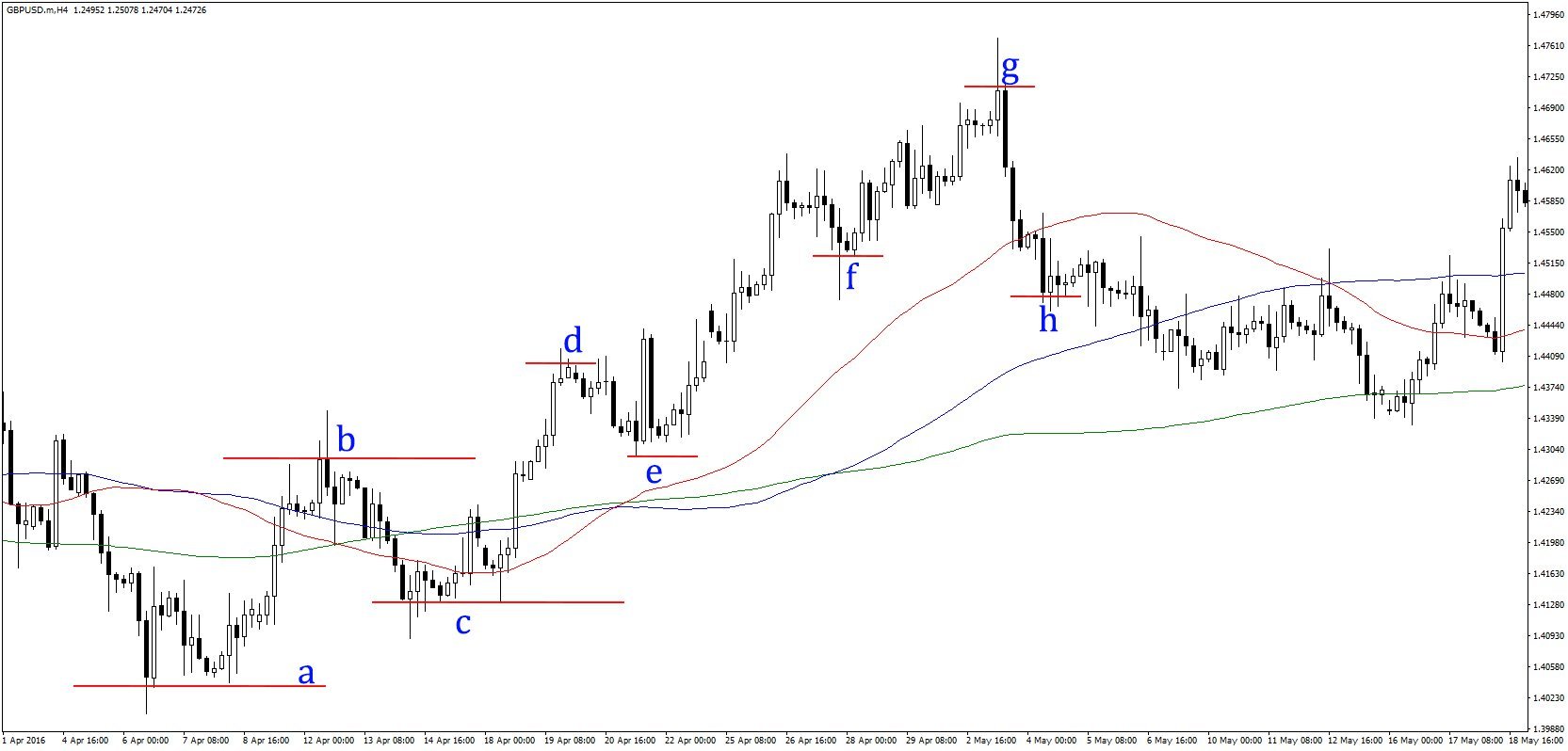 Above, you will notice that the corrective wave between B and C did not engulf the previous uptrend from A to B. The same happened with the corrective wave D to E compared to the uptrend from C to D. However, when the corrective wave from G to H engulfed the uptrend between F and G, this showed that the trend had reversed and that GH was a trend reversal.