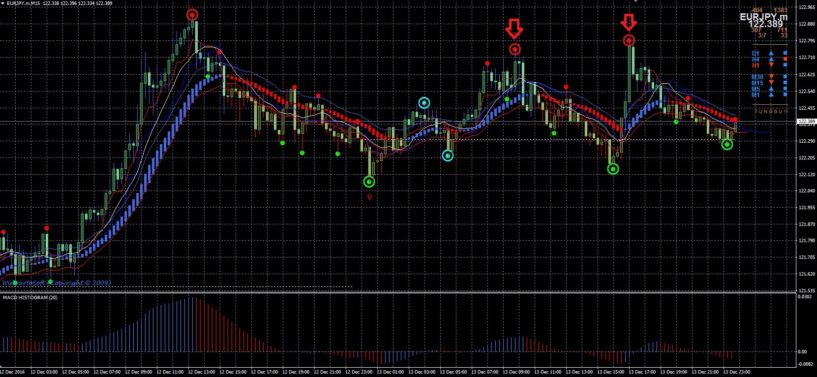 - Mini sinyal – On the top-right-hand side are a bunch of figures representing the direction of the markets on various timeframes from the M1, M5, M15, M30, H1, and H4 to the D1